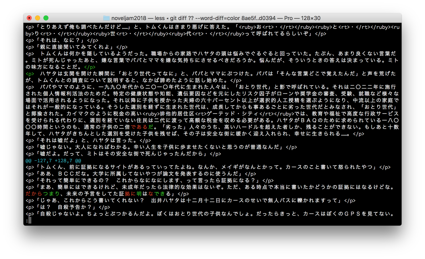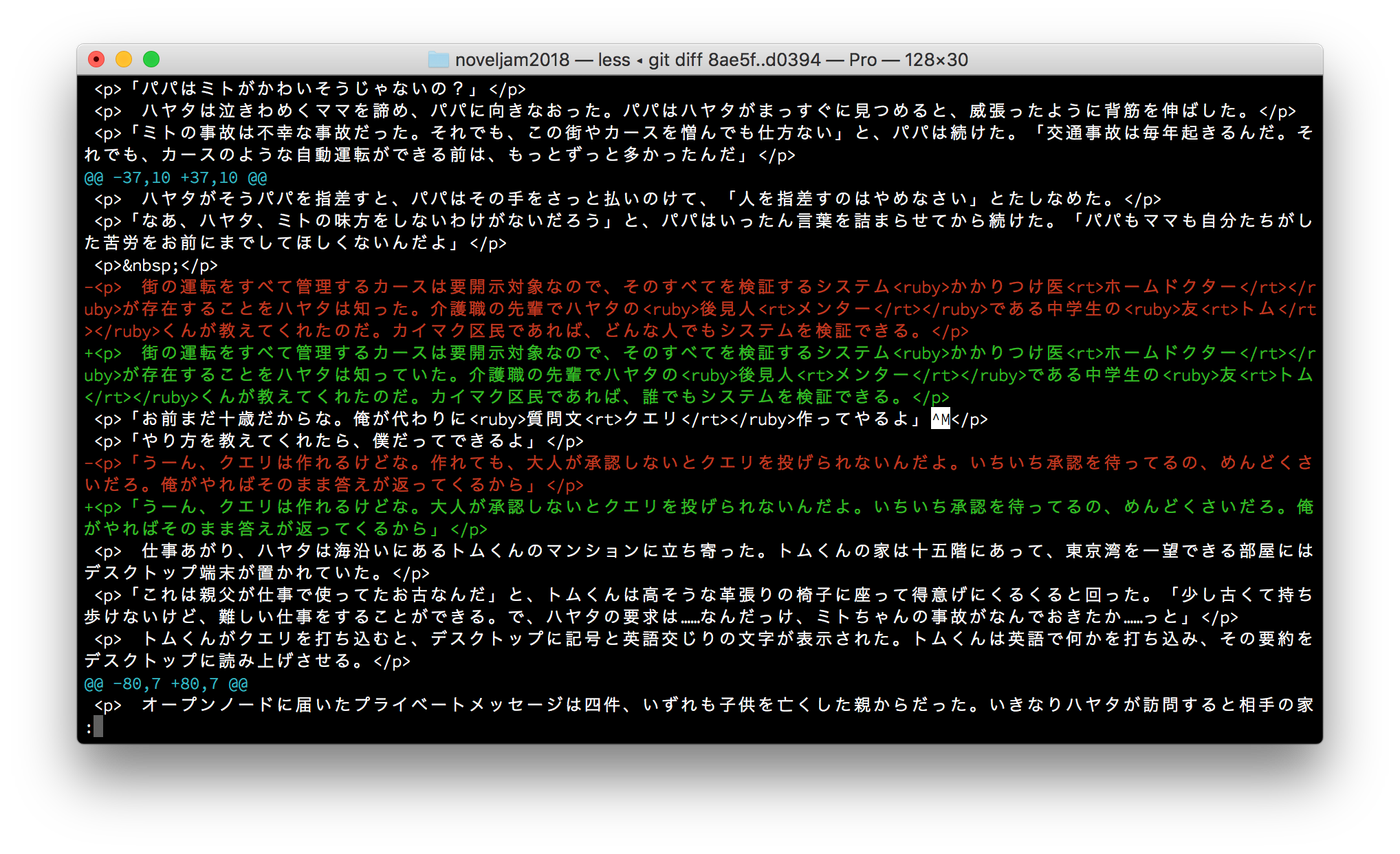 二泊三日で小説を書く過激なイベントNovelJam 2018参加作品である高橋文樹氏の「オートマティック クリミナル」は、GitHubを使って執筆されている。小説では、git diffの欠点がはっきりでる。高橋氏は参加レポートで、こう書いている。
